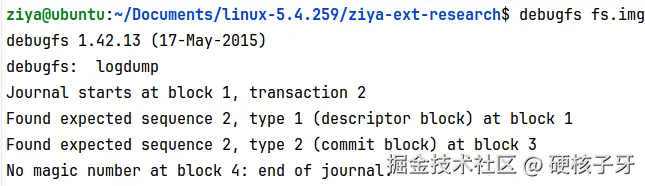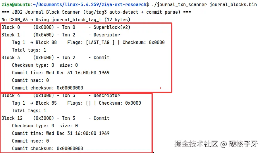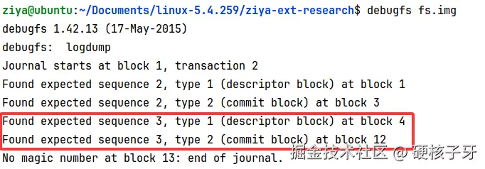 再来看第二段,descriptor信息在block 4中,commit信息在block 12中,block 5、6、7、8、9、10、11,,7个block,是哪些block呢?这个信息ChatGPT没解析出来,自己来猜测解析吧