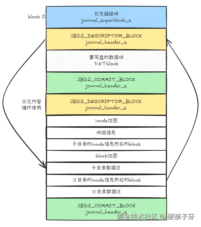 默认情况,jbd2只能使用1M空间,一个block是1024B,jbd2用了1024个block,1M空间是这样用的,结构长这样