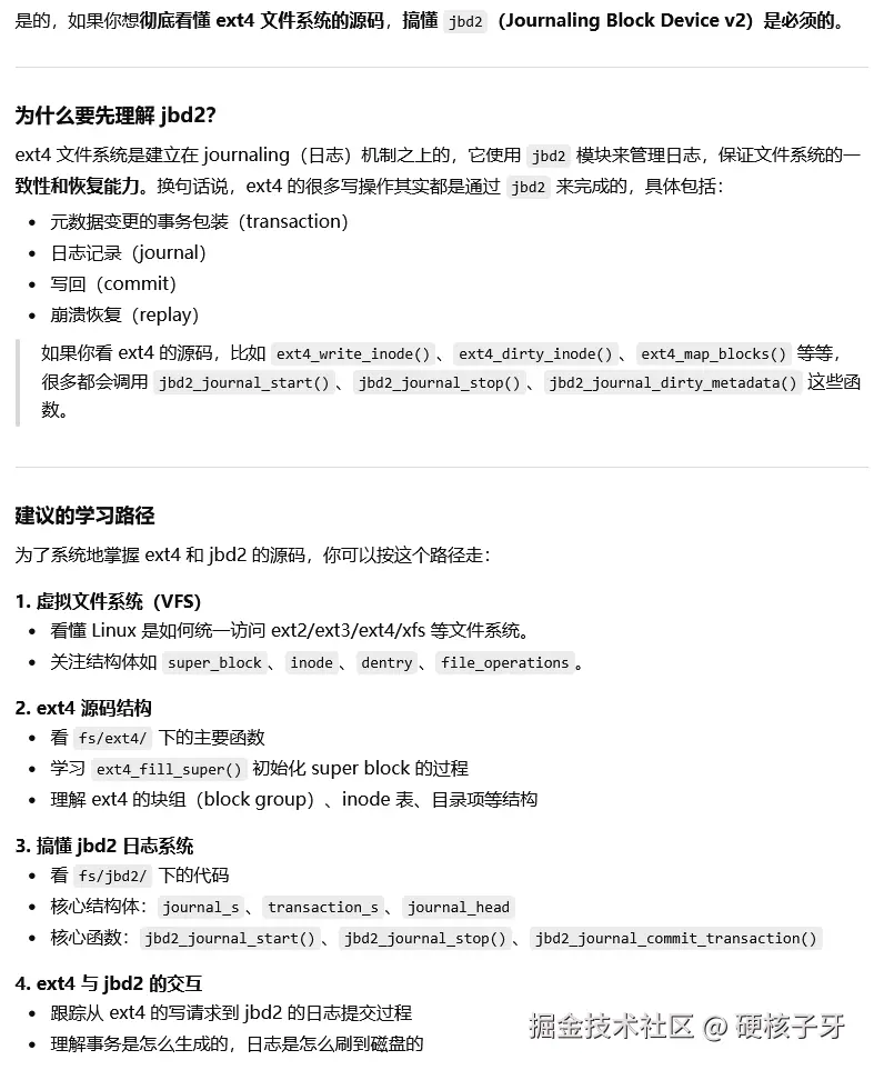 按照ChatGPT说的学习路径,课程《实战Linux内核》四期已经完成了1、2,现在把3搞明白,再去看ext4源码把4搞明白,ext4文件系统,你就能轻松看懂了