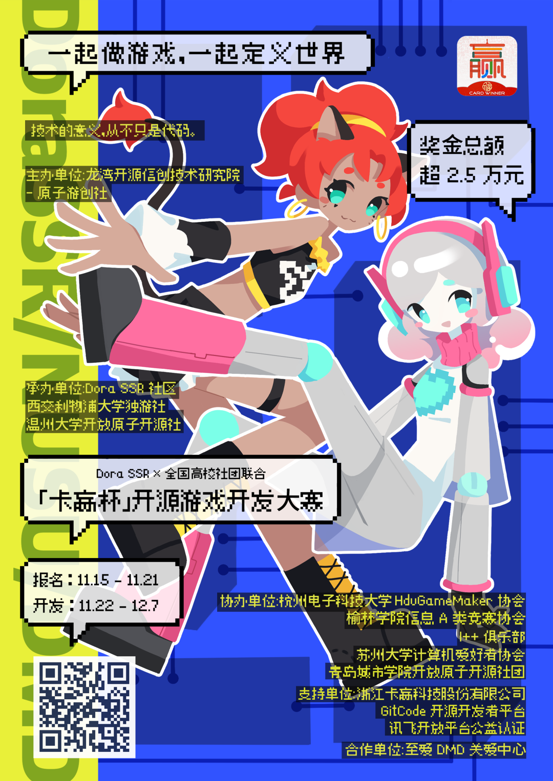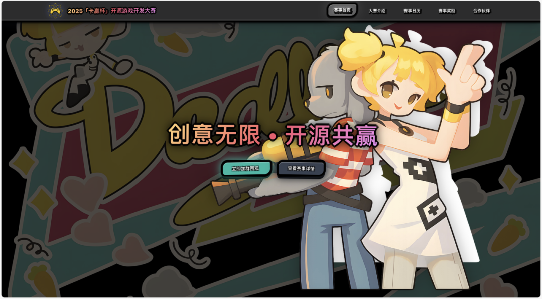 2025「卡赢杯」开源游戏开 发⼤赛 现已开启,⾯向全国⾼校开发者,⿎励使⽤开源游戏引擎(Dora SSR、Godot、Cocos2d-x 等)共同完成⼀款原创游戏作品。
