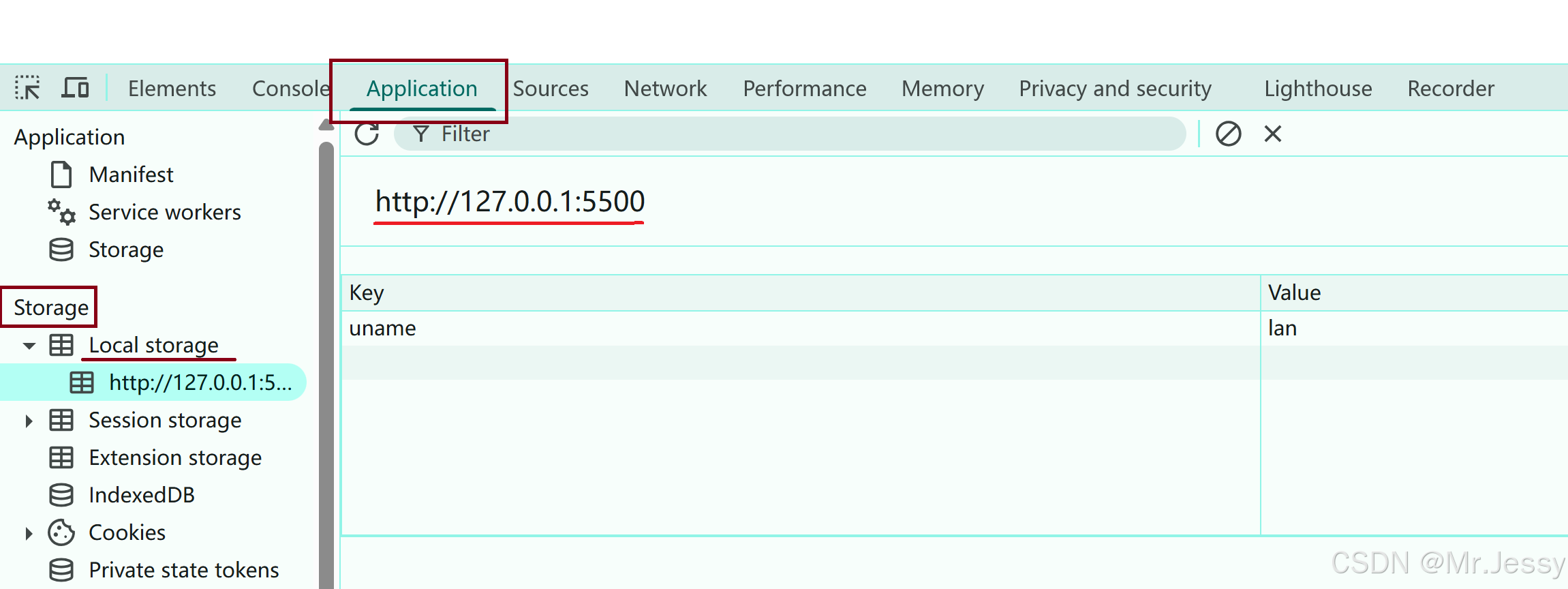 打开浏览器,你可以在应用-仓库-本地仓库中看到刚才我们存储的数据,并且即使是关闭/刷新网页,这个键值对也依旧存在不会消失。当然,你要注意的是它存储仓库是在我们本机电脑的域名下(图中红线部分)