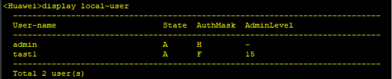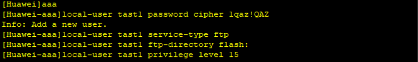 local-user tast1 password cipher 1qaz!QAZ # 定义一个名为tast1的用户,密码为1qaz!QAZ