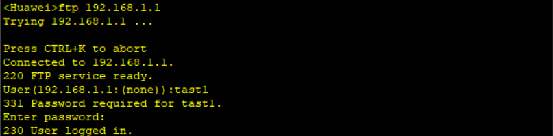 ftp 192.168.1.1 # R2向R1请求FTP服务,请求过程中使用tast账户登录