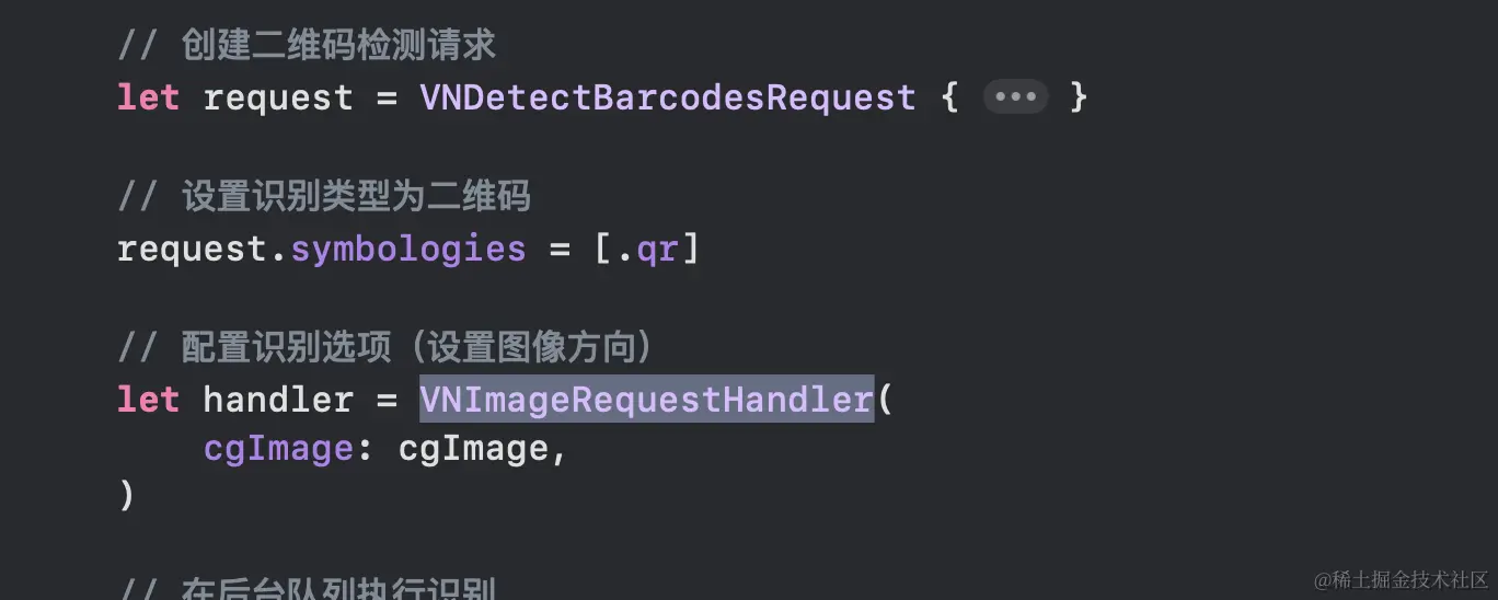 在 Swift 中,VNDetectBarcodesRequest 和 VNImageRequestHandler 是 Vision 框架 中的类,用于计算机视觉任务。VN 是 Vision 的缩写。