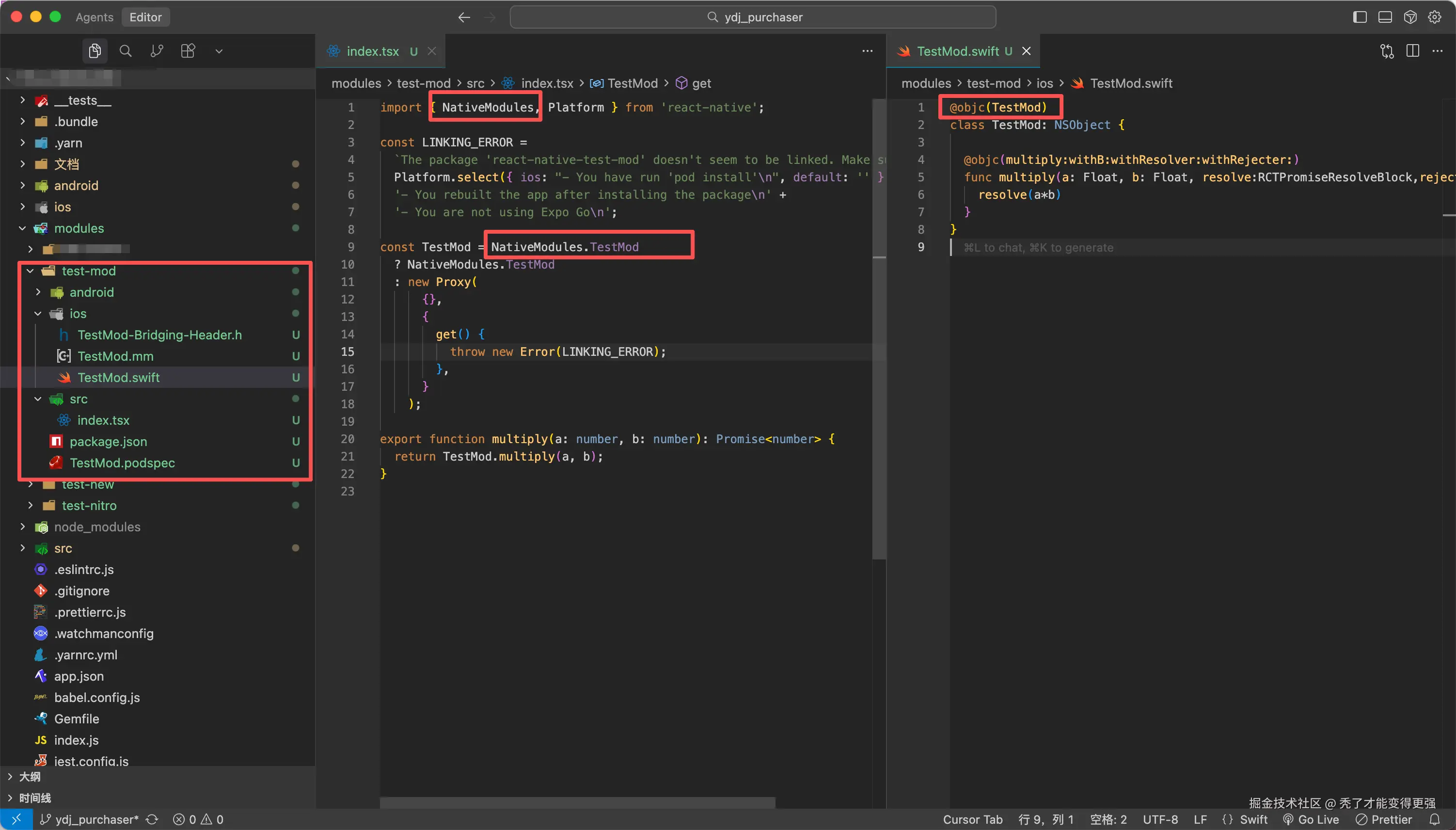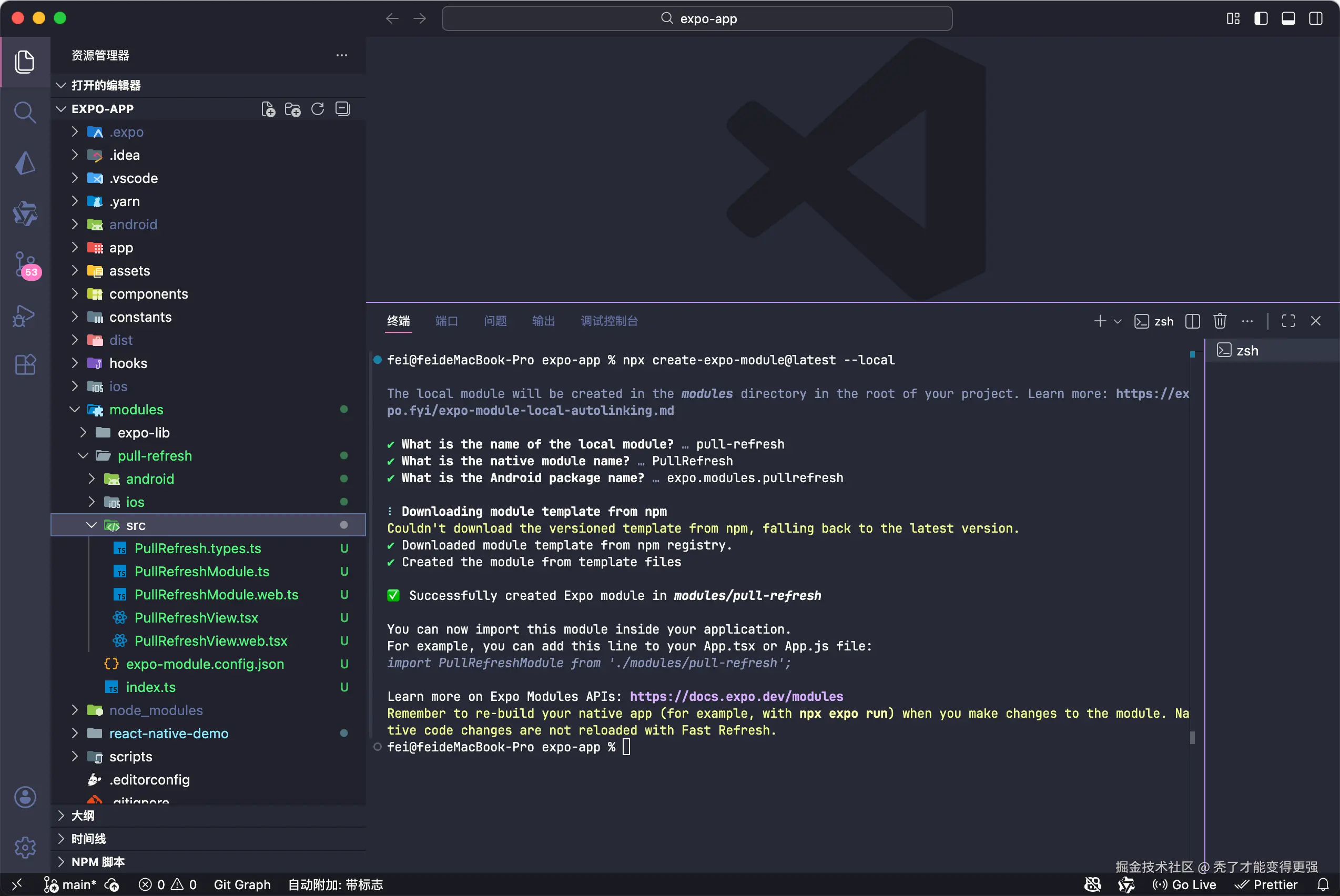创建完成以后,会在项目根目录创建一个modules/你的模块目录,ios同上面Expo安装模块步骤一样。