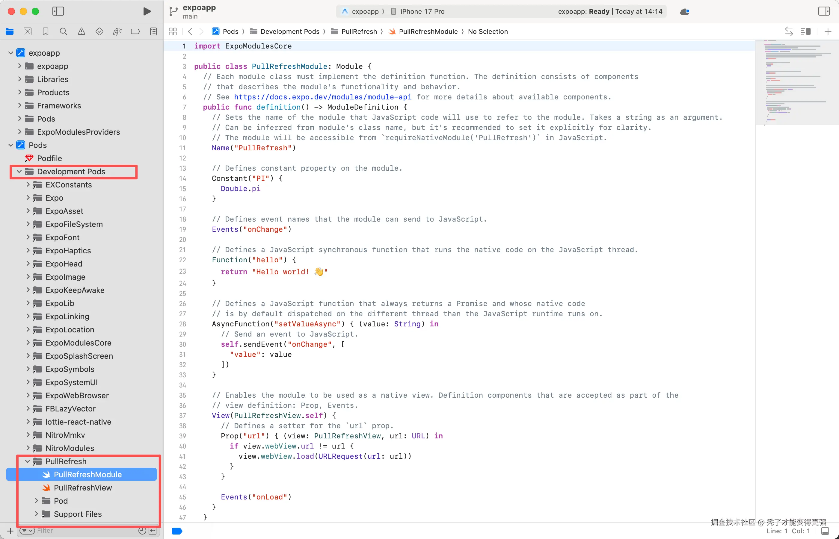 1.3 此时ios打开expoapp.xcworkspace可以看到Development Pods内安装进来的模块,可以在这里进行修改,运行到手机或模拟器