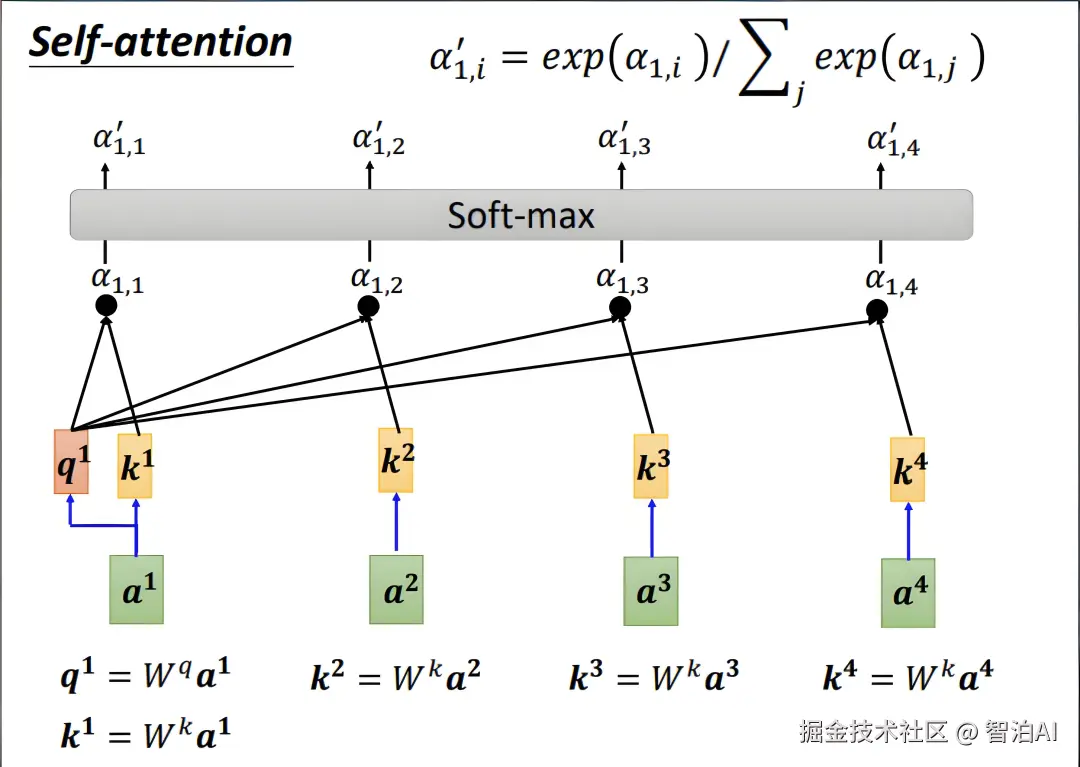q代表查询,k代表键,但是自注意力中这两者是相同的,都是输入张量X。
