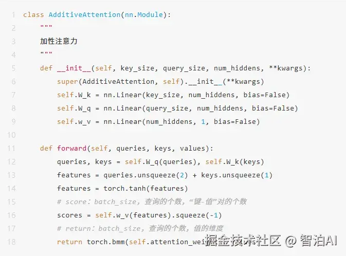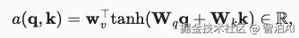 加性注意力:该评分函数不用考虑查询q和键k是否长度一致,其公式为: