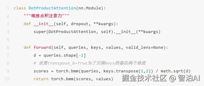 缩放点积注意力:该评分函数需要查询q和键k保持长度一致,其公式为: