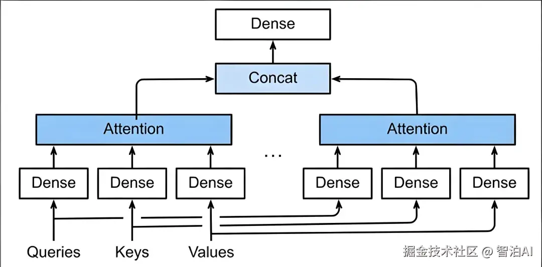 多头注意力机制就是将多个注意力汇聚的结果拼接在一起,这样得出来的结果会包含更多的行为信息,如下图所示: