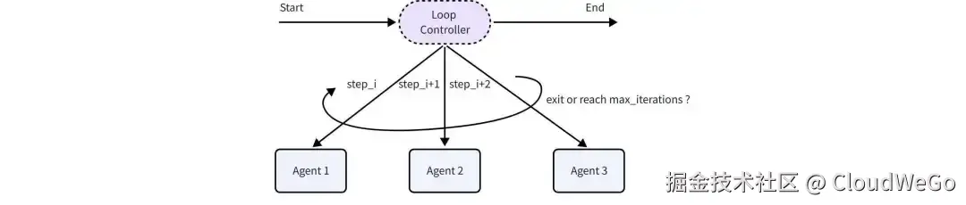 - LoopAgent:重复执行配置的子 Agent 序列,直到达到最大迭代次数或某个子 Agent 产生 ExitAction,每次迭代的结果都会累积,后续迭代的输入可以访问所有历史信息。LoopAgent 基于 SequentialAgent 实现。