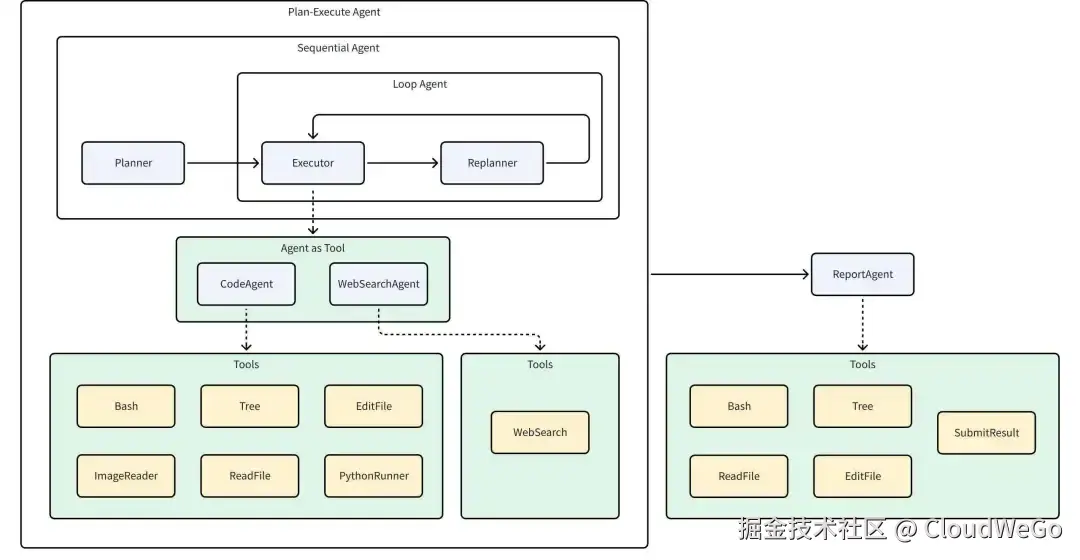 1\] ReAct: *[react-lm.github.io/](https://link.juejin.cn?target=https%3A%2F%2Freact-lm.github.io%2F "https://react-lm.github.io/")* \[2\] Eino 示例代码: *[github.com/cloudwego/e...](https://link.juejin.cn?target=https%3A%2F%2Fgithub.com%2Fcloudwego%2Feino-examples%2Ftree%2Fmain%2Fadk%2Fmultiagent%2Fintegration-excel-agent "https://github.com/cloudwego/eino-examples/tree/main/adk/multiagent/integration-excel-agent")* \[3\] Eino ADK 文档: *[www.cloudwego.io/zh/docs/ein...](https://link.juejin.cn?target=https%3A%2F%2Fwww.cloudwego.io%2Fzh%2Fdocs%2Feino%2Fcore_modules%2Feino_adk%2F "https://www.cloudwego.io/zh/docs/eino/core_modules/eino_adk/")* \[4\] Eino ADK 源码: *[github.com/cloudwego/e...](https://link.juejin.cn?target=https%3A%2F%2Fgithub.com%2Fcloudwego%2Feino%2Ftree%2Fmain%2Fadk "https://github.com/cloudwego/eino/tree/main/adk")* \[5\] Eino ADK Examples: *[github.com/cloudwego/e...](https://link.juejin.cn?target=https%3A%2F%2Fgithub.com%2Fcloudwego%2Feino-examples%2Ftree%2Fmain%2Fadk "https://github.com/cloudwego/eino-examples/tree/main/adk")*