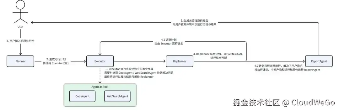 循环运行:Executor 和 Replanner 需要按需循环运行多次,每次循环运行都是先运行 Executor 后运行 Replanner