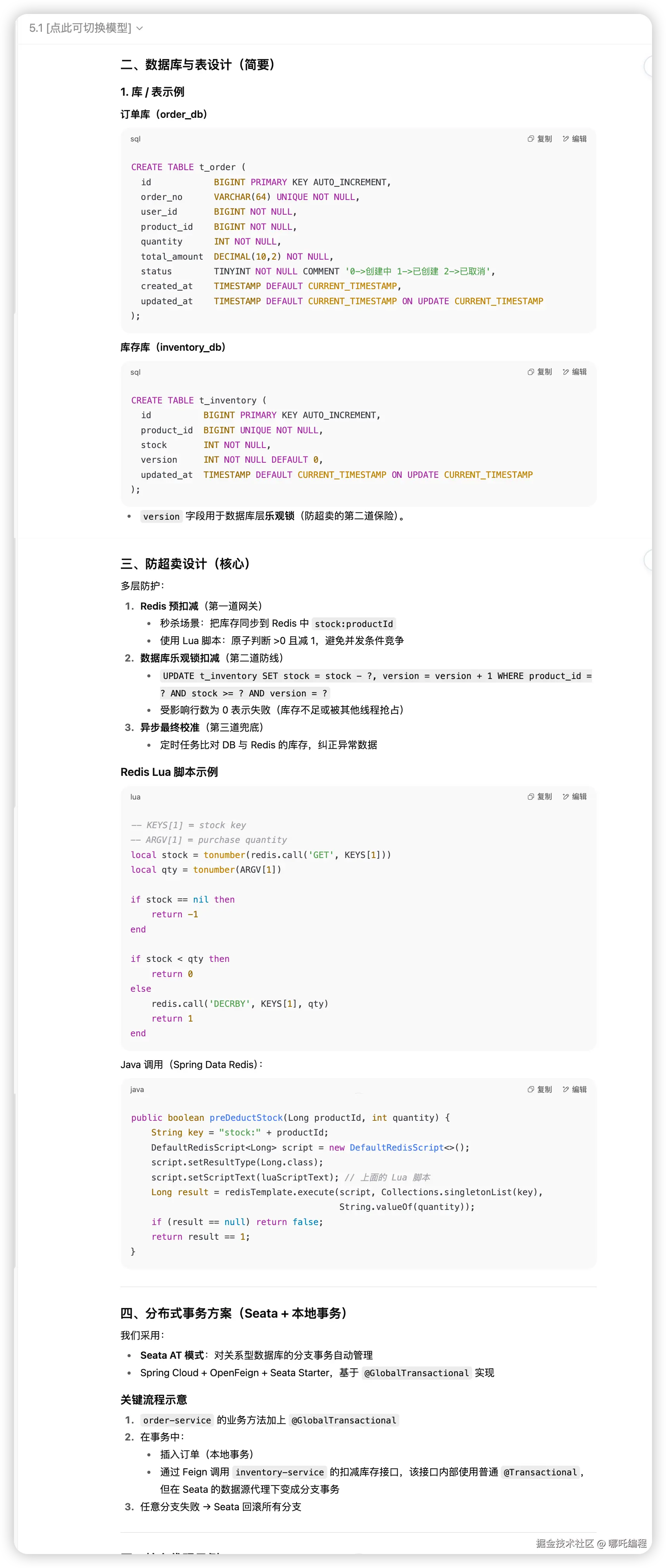 请用 Java 设计并实现一个支持高并发的电商微服务系统(基于 Spring Boot/Spring Cloud),要求包含订单、库存等服务,需解决分布式事务与超卖问题,使用 Redis/Kafka 进行异步解耦,并提供核心代码、配置及部署方案,同时说明高并发优化与容错限流设计思路。
