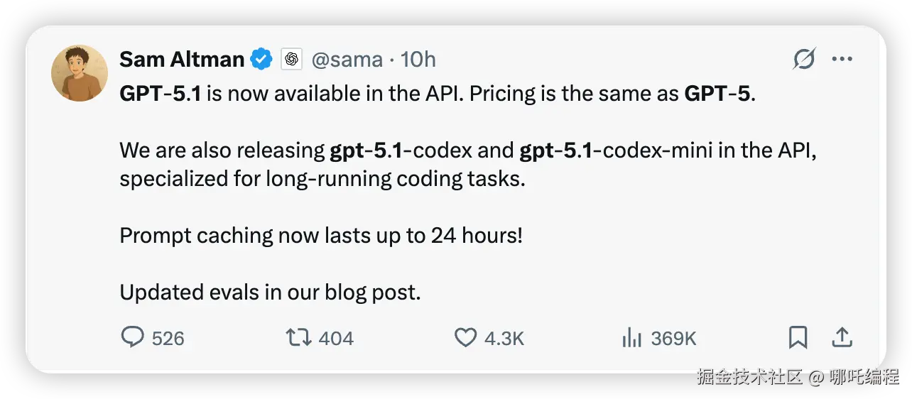 GPT-5.1 在消息中被指出有"推理"与"思考"能力进一步强化,这意味着在编程场景(例如多步逻辑、复杂函数、API组合)可能表现更佳。