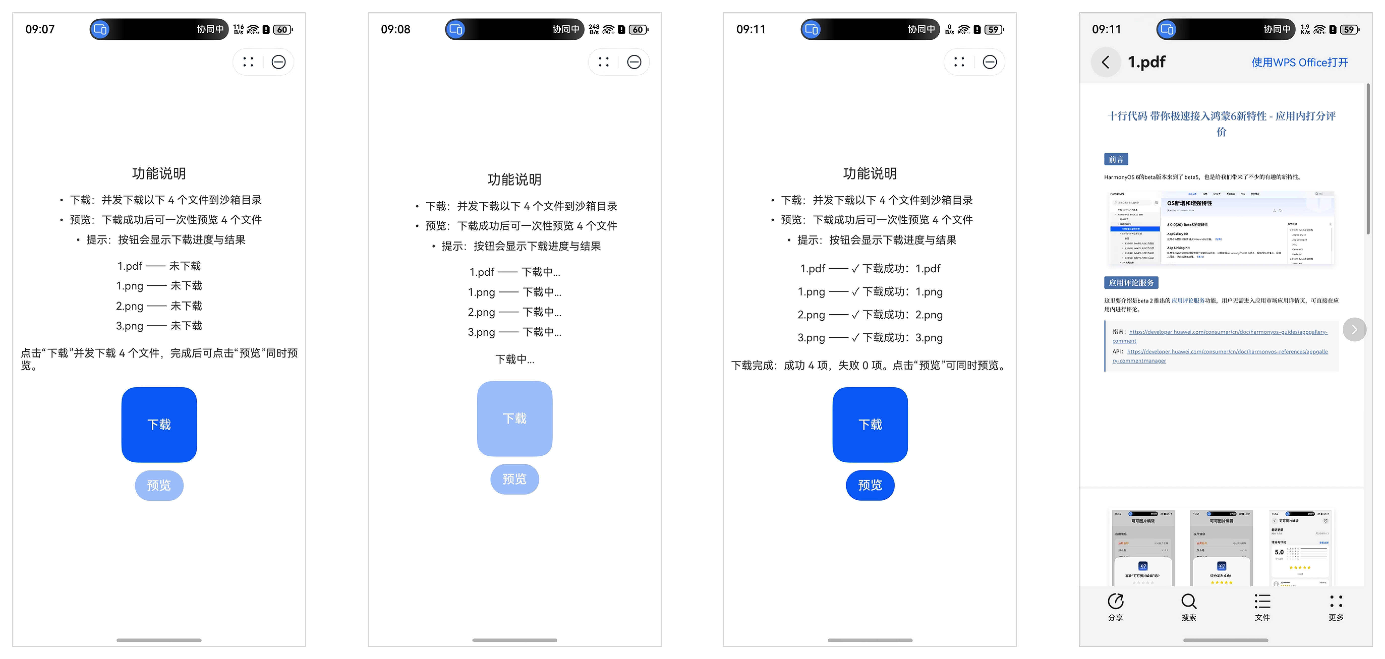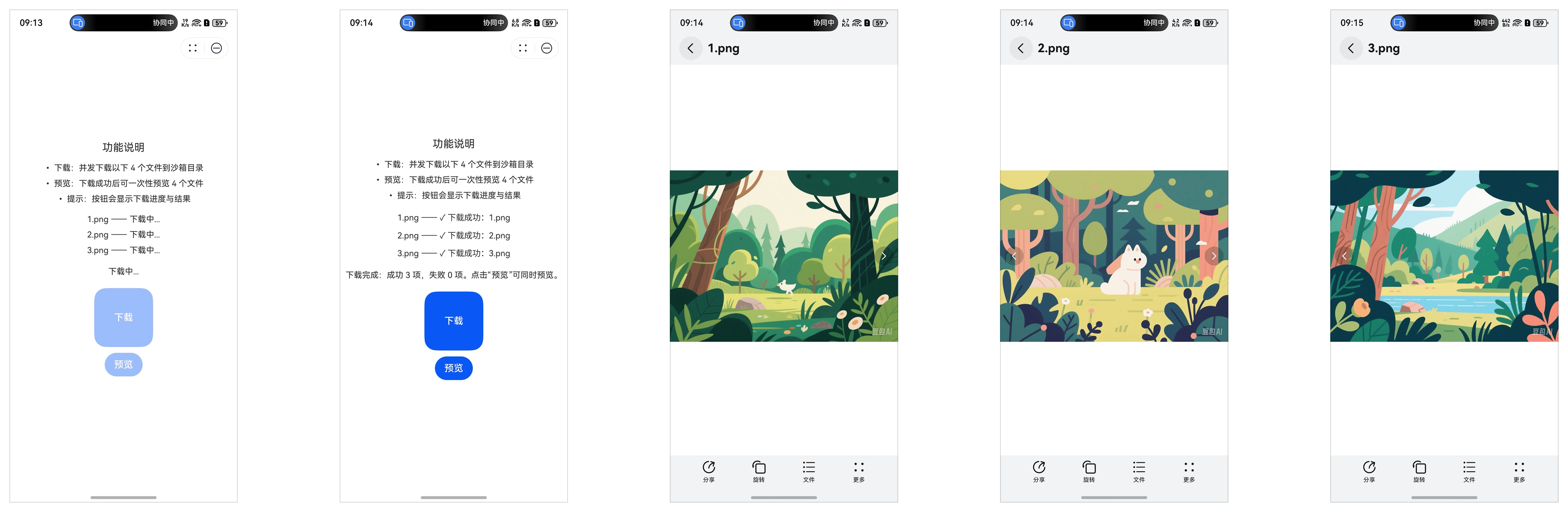 - 点击"下载"按钮,并发下载上述 4 个文件到应用沙箱目录。
