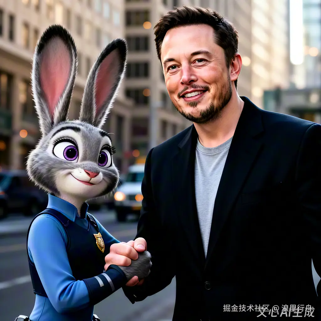 Case展示: 一张马斯克与《疯狂动物城》朱迪警官握手的图片。