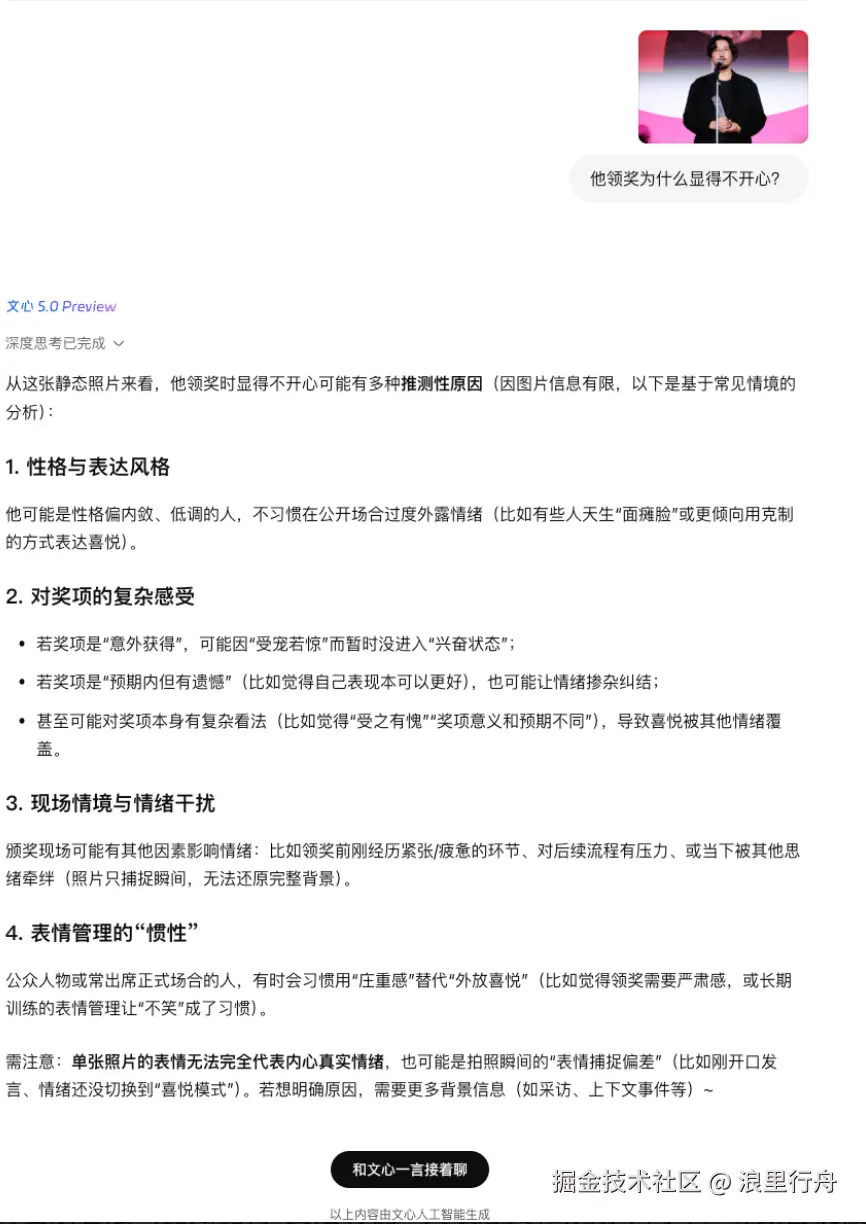 Case展示: 面对一张人物在颁奖典礼上表情平淡的照片,当被问及"他为什么显得不开心?"时,传统模型可能会简单回答"他看起来很严肃"或"他可能不高兴"。