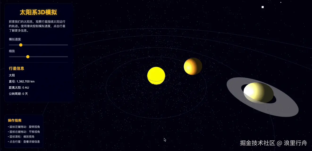 Case展示: 输入指令"模拟太阳系,8大行星围绕太阳旋转,镜头拉近地球"。