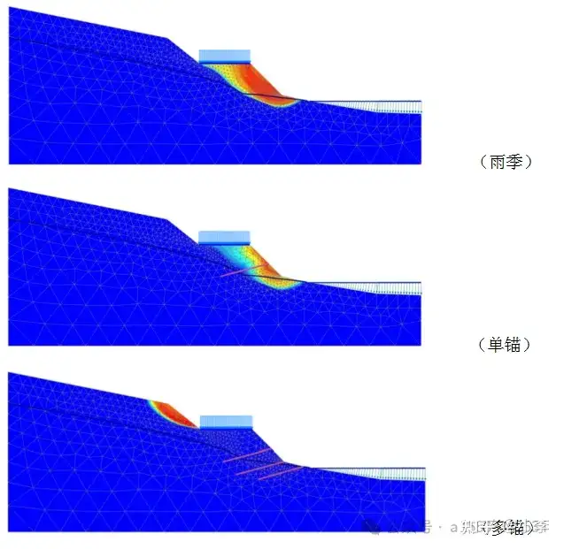 (2)不同水位条件与锚支护条件下的路堑边坡稳定性分析