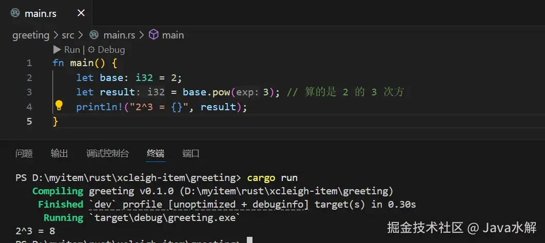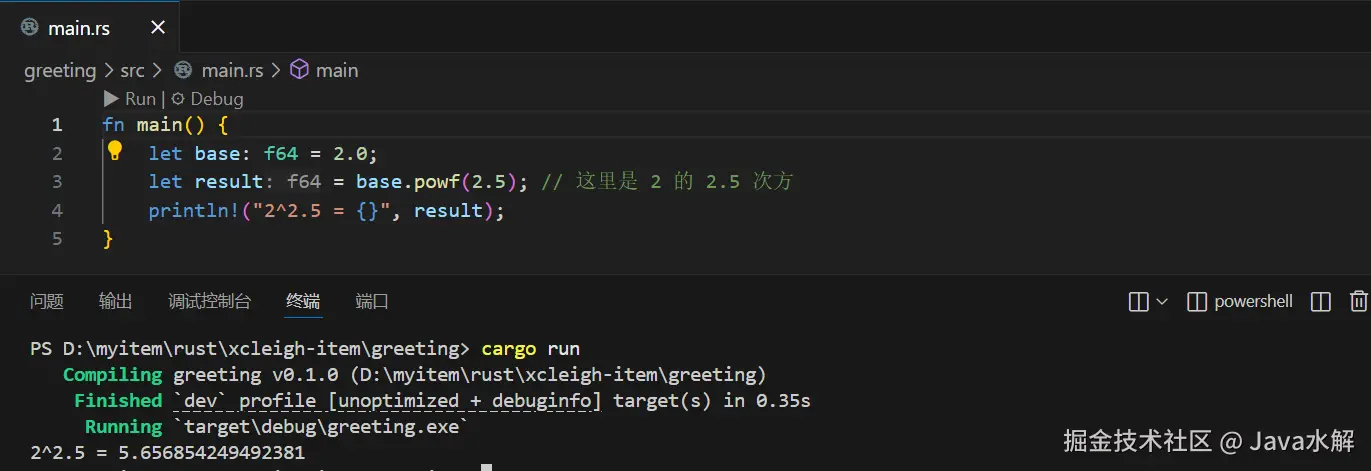 这里得提一句,Rust 里可没有 ** 或者 ^ 这种乘方运算符(别搞混了,^ 在 Rust 里是按位异或)。要是想算乘方,得用它内置的 pow 或者 powf 方法,不同类型的数字用法还不一样: