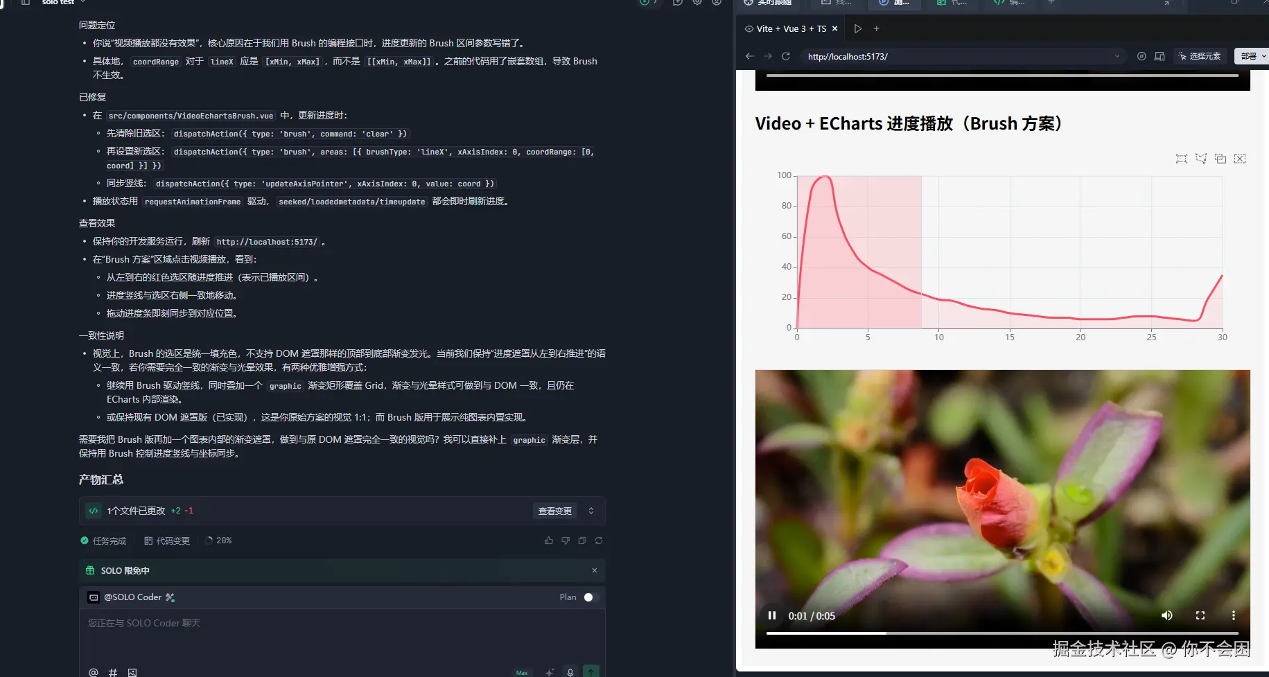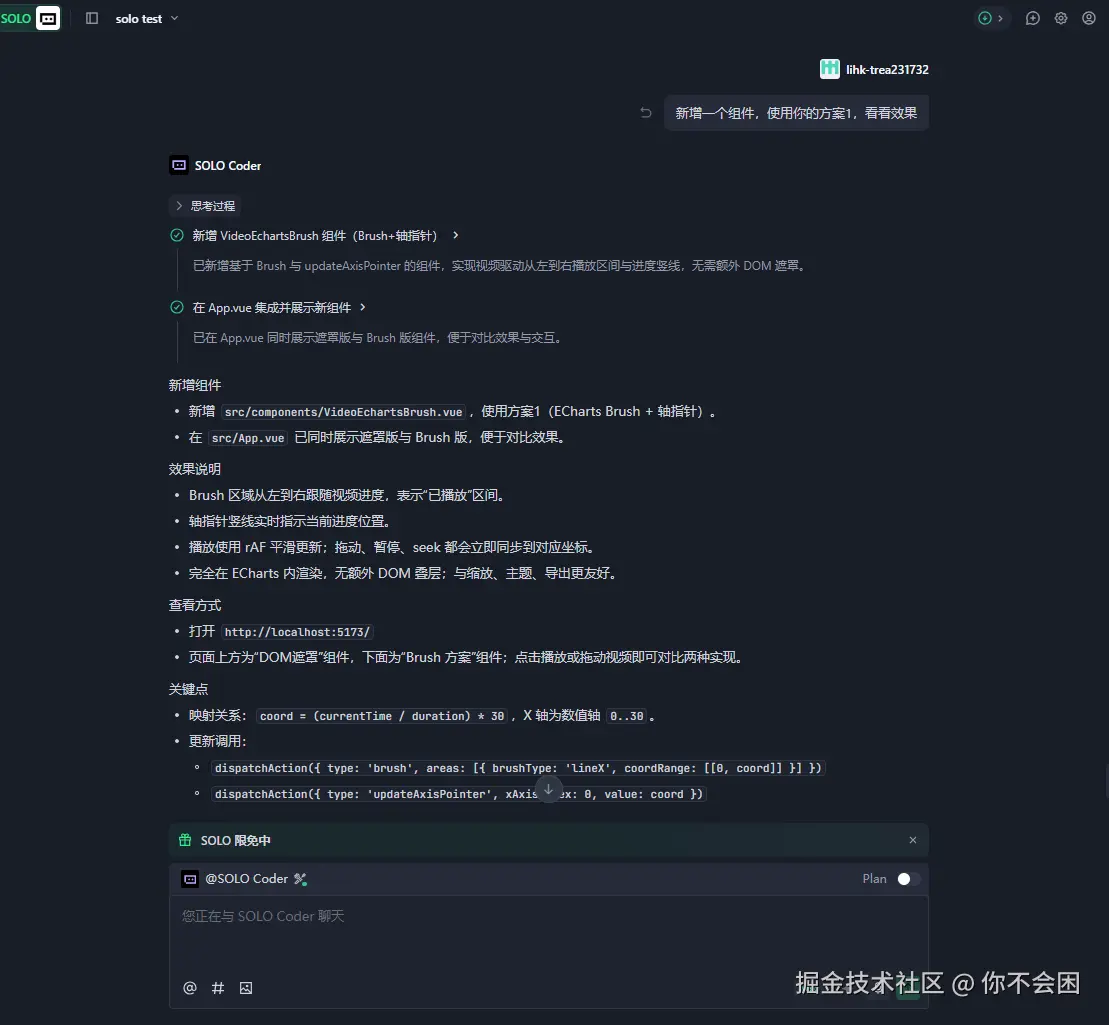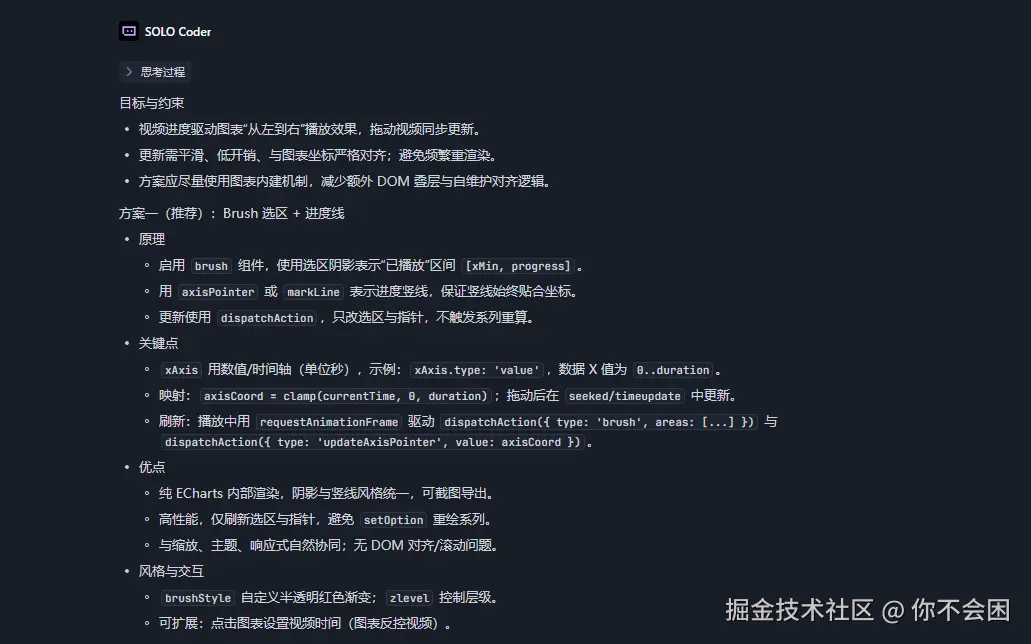 最终的效果实现了,就是经常会找不到bug就要切换方案,其实方案1没有问题的,这一点还是很烦,Trae没有注意到有一行代码导致这个bug,还得前端来debugger,发现只要暂停就重置为0 chart.on('finished', () => updateBrush(0))