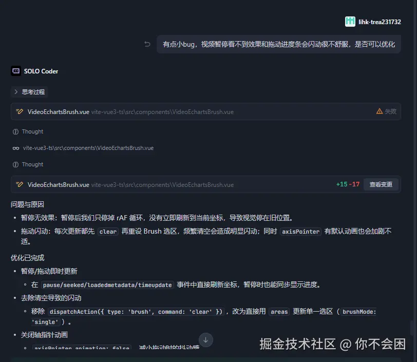 有点小bug,视频暂停看不到效果和拖动进度条会闪动很不舒服,是否可以优化,再次提问Trae