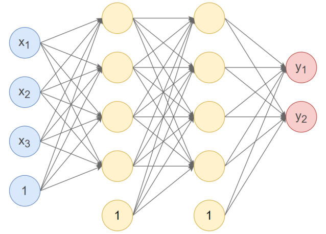 4 个输入(实际上 3 个变量输入一个偏置),2 个输出,三层网络,2 个隐藏层。