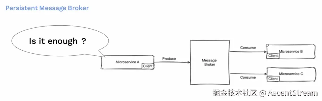 我们通常使用可持久的消息队列(消息代理Broker)来实现这一点。消息代理位于服务 A 和服务 B 之间。服务 A 向消息代理生产消息,而服务 B 则从消息代理中消费消息。当有多个消费者或多个服务对同一消息感兴趣时,它们就也会消费相同的主题。