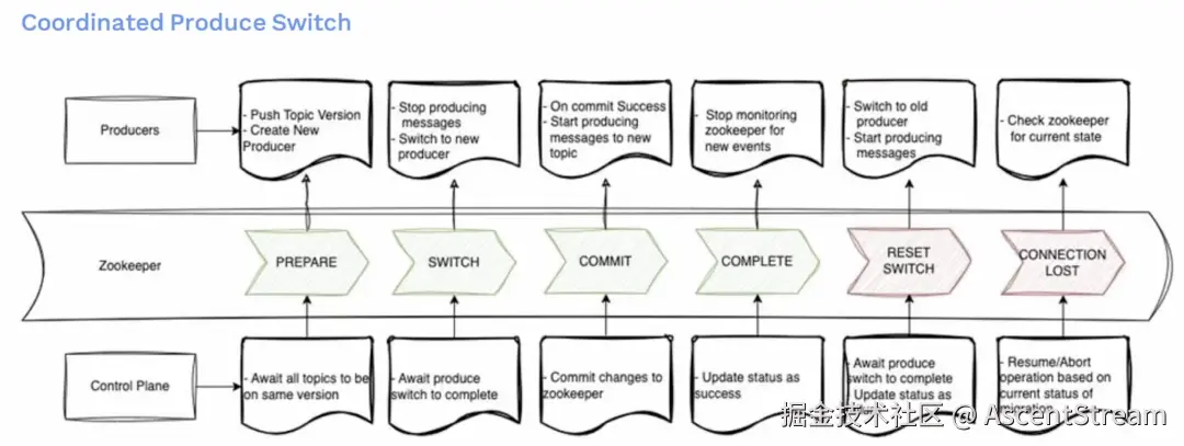 - 接下来将来到完成阶段。控制平面将状态更新为成功,生产者将停止监控Zookeeper。