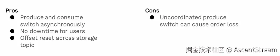 这个方案的优点是生产者和消费者可以同时进行,这意味着用户的顺序性得到保留。任何生产出的消息将会以产生的顺序被消费,因为迁移没有带来这方面的改变。而且方案很容易实现。然而,也有一些不利因素,由于这些原因,我们无法继续采用这种方法。其中之一是,我们可能会有多个消费者对应一个生产者,一旦其中有消费出现延迟的,就会使我们的生产停机时间变得很长,这是我们不希望让用户经历的。另外,偏移重置不可用,你不能将你的消费指针回退到 Kafka,即使用户已经为该主题设置了某种保留策略。那时候,我们将不得不丢失那些信息,这对我们来说可能是不可接受的。