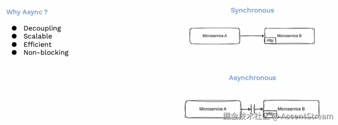 在同步操作中,服务 A 通过 HTTP 连接到服务 B,并等待其响应,直到服务 B 完成请求的处理。然而,这种方式并不可扩展,因为存在阻塞,并且与服务 B 紧耦合。这就是为什么我们使用异步处理:在异步处理中,服务 A 将请求发往服务队列,然后继续执行自己的任务,不会等待服务 B 的响应。服务 B 可以自行决定处理时间,甚至可以延迟处理。这意味着两个服务在职责上是解耦的,它们可以独立地扩展,并且效率高,不会发生锁定。