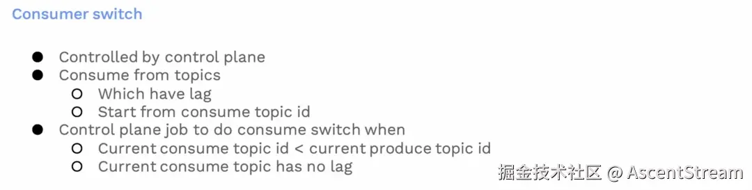 消费的切换是相当直接的。消费者由控制平面指定从哪里消费消息。从指定的消费 ID 开始消费,或者消费主题里面滞后的消息。一旦完成,控制平面将更新消费者主题 ID 并移至下一段,这个时候,消费者就可以发送切换了。