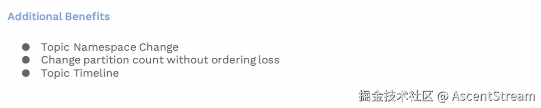 我们通过这种迁移策略获得了一些额外的好处。例如,我们现在可以更改主题的命名空间,这在 Pulsar 中本来是不可能的。我们甚至还可以利用这一特性,将主题从一个命名空间迁移到另一个命名空间。我们还可以在 Pulsar 中更新主题的分区数而不会失去消息的顺序性。这是目前任何消息队列都不能提供的。
