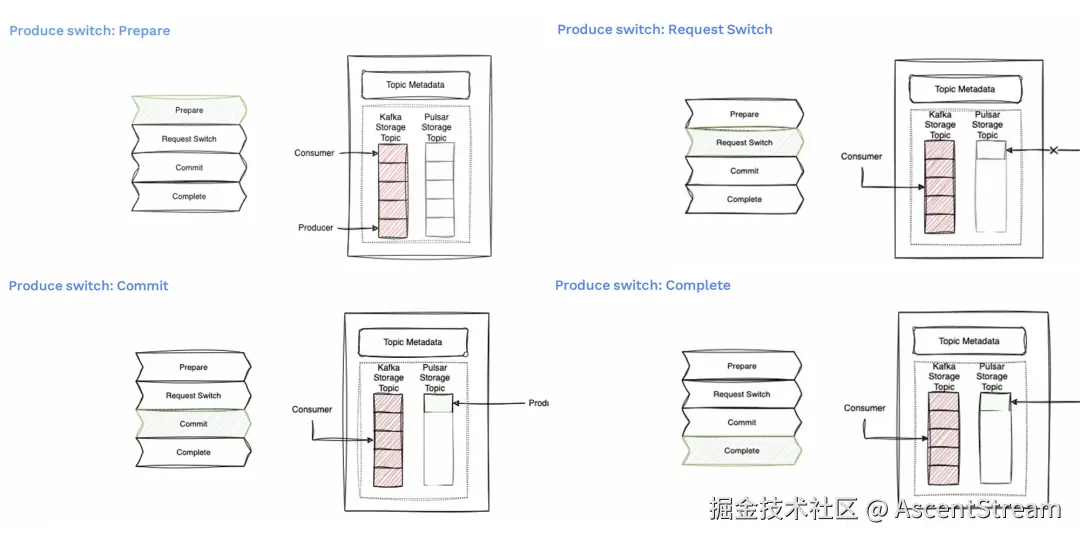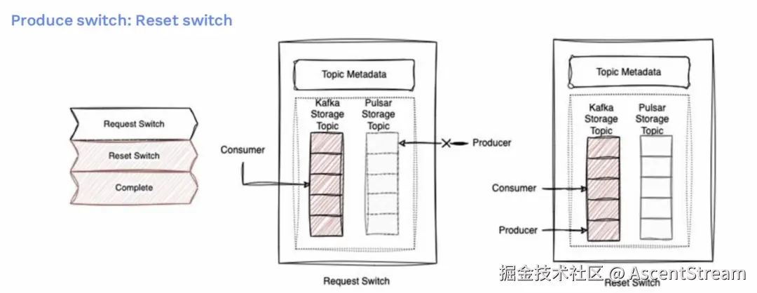 如果出现失败,例如在请求步骤中,生产者指向了 Pulsar 上,但无法生产消息。这时候将重置切换,生产指针将回到 Kafka 主题,并开始只向 Kafka 发送消息。整个操作将被标记为完成,但状态为失败。