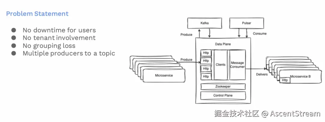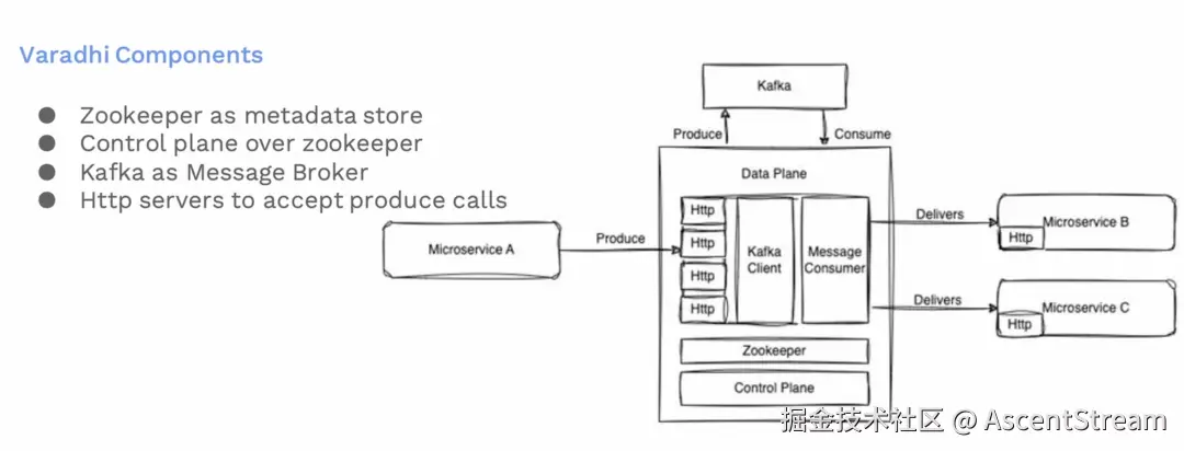 这是Varadhi的组件架构图。其中ZooKeeper 维护元数据。我们有一个控制平面,允许用户配置他们的订阅主题和端点,以及设置他们要从哪里接收消息。我们还有个HTTP服务器,这些服务器处理来自用户的生产请求。这些生产请求随后被持久化在消息代理中。