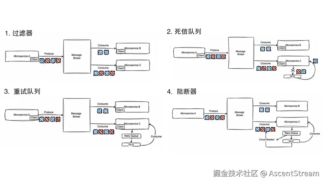 现在的微服务都会围绕消息代理构建多种多样的服务,以满足其端到端的需求。而简单的消息队列,无法满足这类多样化的需求。复杂点的业务都需要考虑失败管理。
