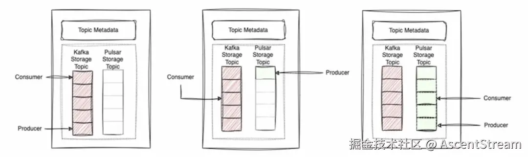 - 之后进入提交阶段。控制面将指针从Kafka主题更改为到 Pulsar 主题,并在Zookeeper中更新状态。生产者在确认更新成功后,将开始向新的主题发送消息。