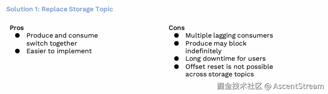 第一个方案是更换存储 Topic,这是最简单的方案。但是要从 Kafka 替换为 Pulsar 的存储主题,我们得先暂停生产,等待消费者追上来。一旦完成同步,也就是说 Kafka 存储主题中的所有消息都被消费了,然后我们就可以用 Pulsar 替换它了。同时生产者和消费者的指针都是切换到 Pulsar。这样就可以从 Pulsar 主题上进行消费和生产了。