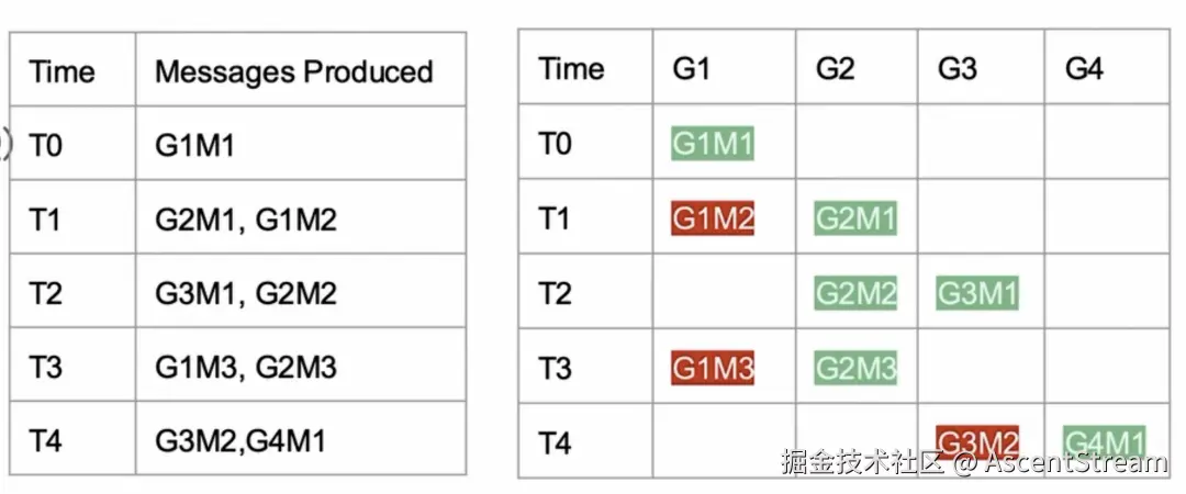 组内有序(Group Ordering),这是用户会在消息队列服务中寻找的一个重要特性。在许多消息队列系统中,为了保证同一个组的消息被顺序处理,系统会确保同一组的所有消息都进入到同一个分区。只不过,这时候在同个分区内,也可能有来自不同组的消息。在这种情况下,需要有一种机制来跟踪每个组内的消息处理状态,并确保按顺序处理消息。例如,如果一个组的第一条消息在时间点T0被成功消费,然后同一组的第二条消息在时间点T1失败了,那么在时间点T3来自同一组的第三条消息就不应该被处理,直到问题得到解决。因此你需要维护一个状态管理系统,来记录每个消息的处理结果,并基于这些信息来决定是否处理后续的消息。