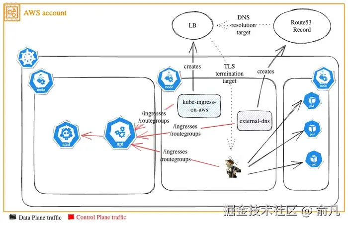 我们用 Skipper(HTTP 反向代理)来实现 ubernetes Ingress 和 RouteGroups 的控制平面和数据平面。创建 Ingress 或 RouteGroup 将会产生带有 TLS 终止功能的 AWS LB,该 LB 会通过 kube-ingress-aws-controller 与 Skipper 进行通信,同时在 Skipper 上设置 HTTP 路由,并通过 external-dns 将 DNS 域名指向该 LB。
