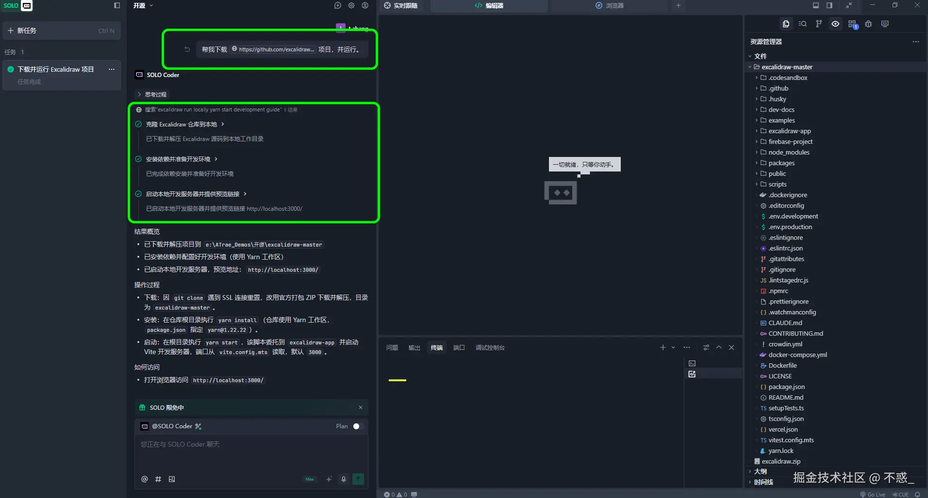Excalidraw 是一个开源、类手绘风格的虚拟白板工具,支持无限画布、暗色模式、图形库、导出 PNG/SVG、自由绘制、多语言、快捷键与绑定箭头等丰富能力。其官方应用原生支持 PWA 离线、本地优先存储、纯前端架构,非常适合私有化部署或内网使用。 要是你之前动手部署过开源项目,你应该懂那种感觉:教程看着简单,结果一动手就开始打怪,git clone → 解压 → 安装依赖 → 处理网络代理 → 启动服务 → 校验端口 → 本地预览。而这些步骤每一步都可能踩到网络、依赖、端口占用等坑。我以前搭这个项目,大概能踩八种不同的坑。但现在,用 SOLO Coder,我只需要一句话。下面我就把两种方式做个对比,你就知道差别在哪里了。
