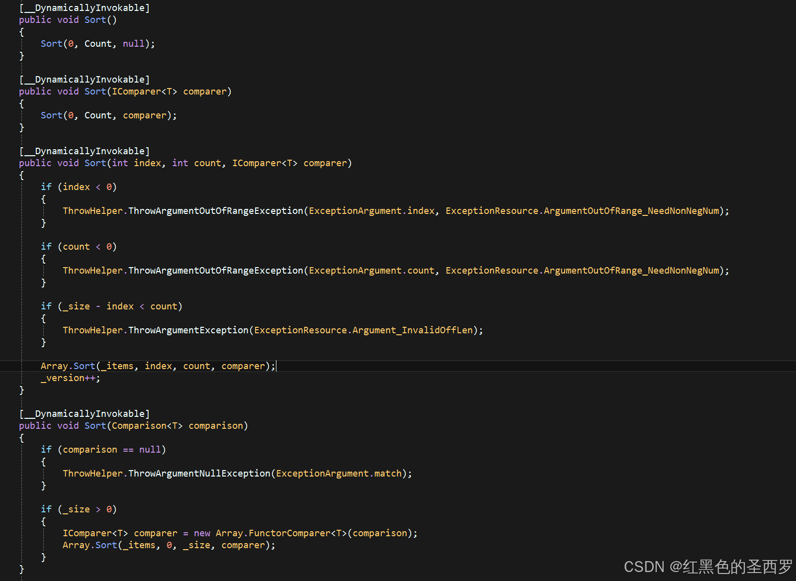 第三个方法的index参数表示从哪个索引开始,count表示要排序的个数,comparer表示实现了IComparer接口的类型,用于实现排序规则,可以看到前两个方法都是从头开始全量排序。