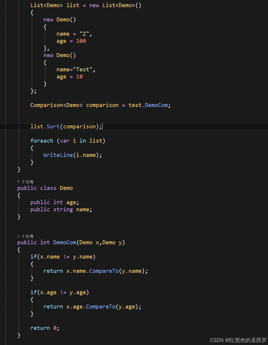 比如这里的Demo类型,实现了自定义的比较方法,先比较name,再比较age