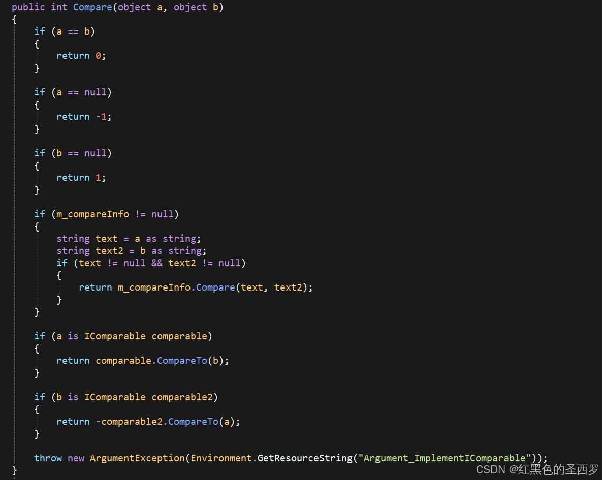 可以看到,虽然Default会传入一个compareInfo,但是因为传入的对象类型在强制类型转换为string后其实是null,所以会进行下面的判断。
