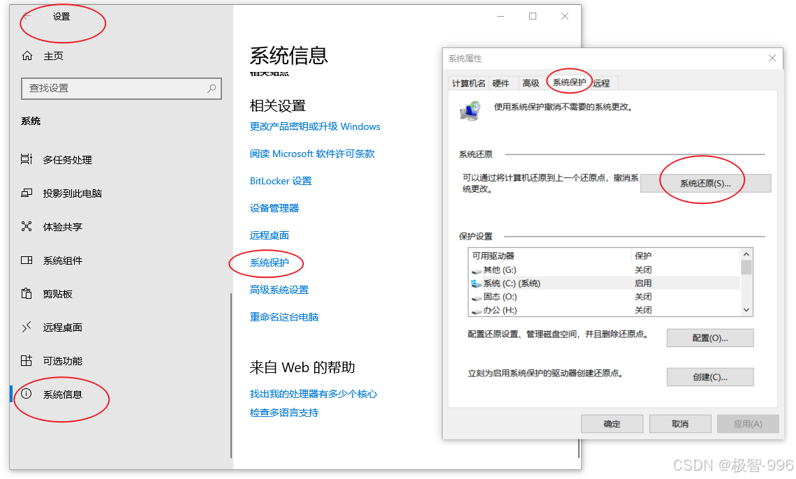 打开 "设置"→点 "系统"→选 "系统信息"→点 "系统保护"→ "系统还原";