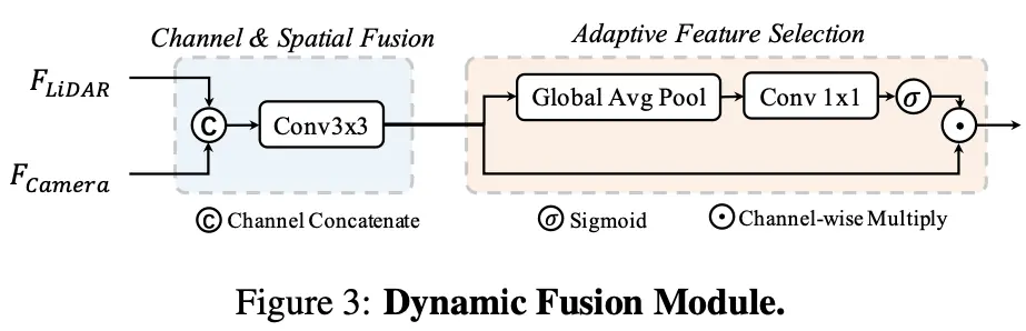 动态融合模块的作用是将 concat 后的 相机、 LiDAR 的 BEV 特 进行有效融合,BEVFusion 应用一个简单的通道注意力模块来选择重要的融合特征,网络结构图如下所示: