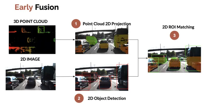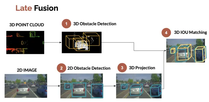 后融合是指摄像头和激光雷达等各传感器独立完成感知任务(如检测、分割),最后在结果层面进行融合(如加权,IOU 匹配等),因此也称之为目标级融合。例如,可以将摄像头的 2D 边界框投影到 3D 边界框,然后将这些边界框与 LiDAR 检测过程中获得的边界框进行融合。
