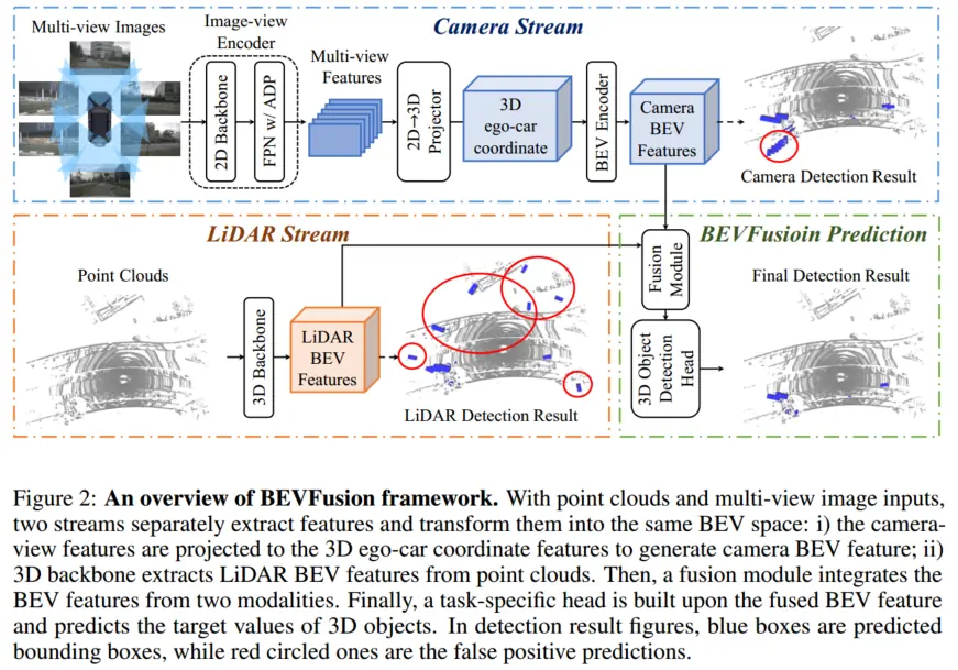 BEVFusion 是典型的中融合方法,将来自相机和 LiDAR 的原始输入编码到同一个 BEV 空间。如下图所示,BEVFusion 主要由相机流、激光雷达流、动态融合模块和检测头组成,分别简单看下