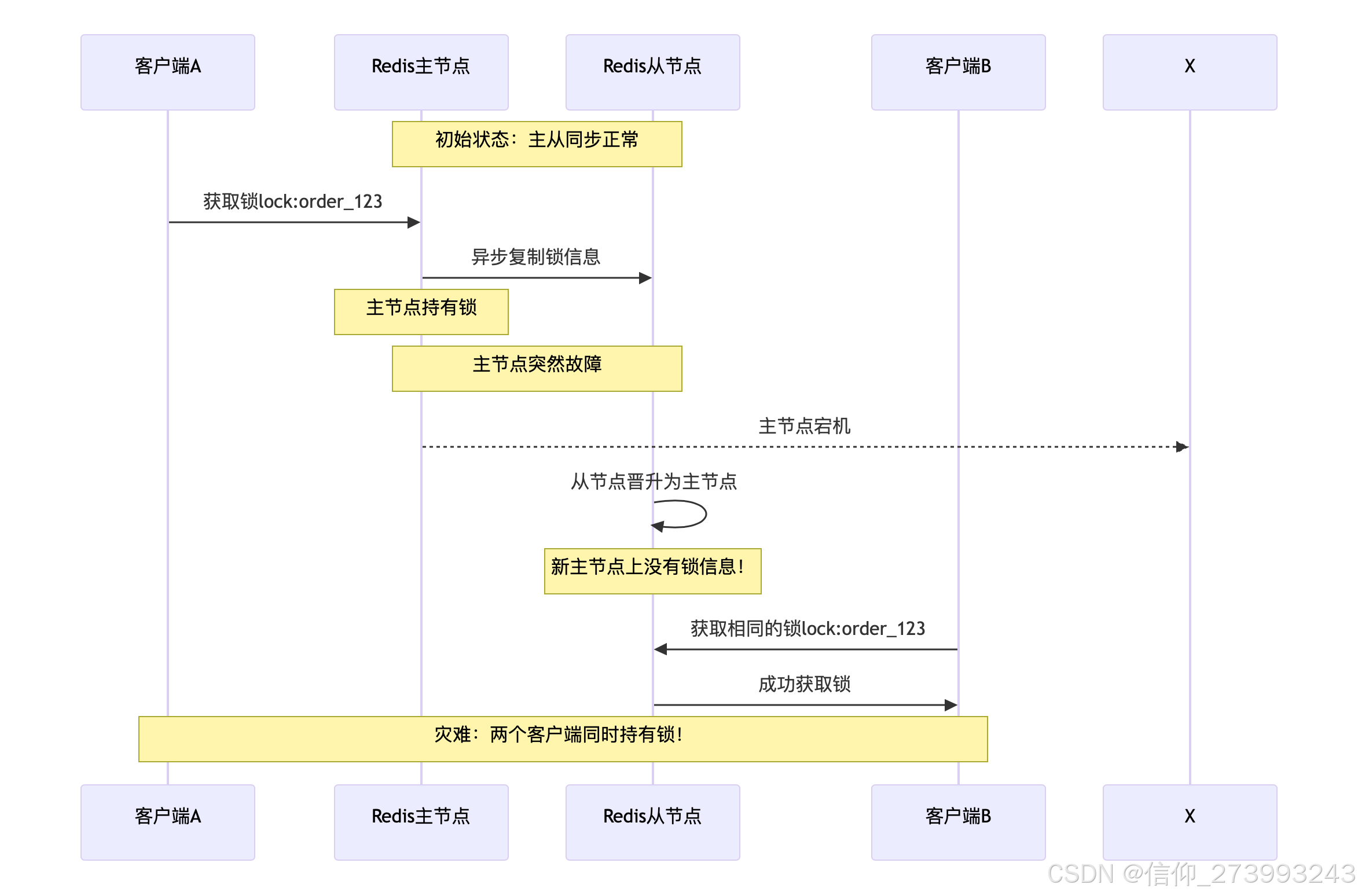 简单说:就是一个主节点,主节点设置锁,从节点还没同步复制完成,主节点就挂了,从节点成了主节点,另外一个线程来设置锁,也能设置成功。最终导致多客户端同时持有锁。